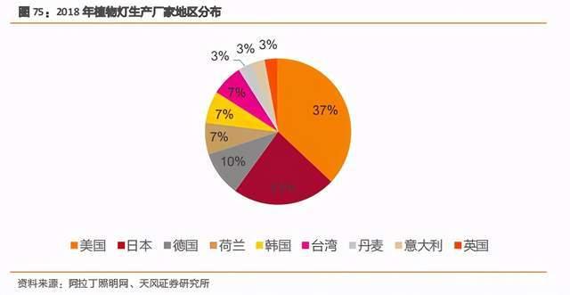 海外巨头布局成熟,欧美日本应用广泛。目前全球植物灯市场上除中国大陆地区之外,北美、欧洲和日本地区应用最为成熟,从数据统计显示美国和日本地区的知名制造厂家分别占比是 37%和 23%,是植物灯应用市场最为活跃的地区。植物照明虽是新兴市场,但国外巨头已开发得较为成熟,并早已在专利方面进行严密的布局,尤其是上游芯片领域的核心专利。在开发模式上,则基本是 LED 光源公司与植物工厂相配合的模式进行。