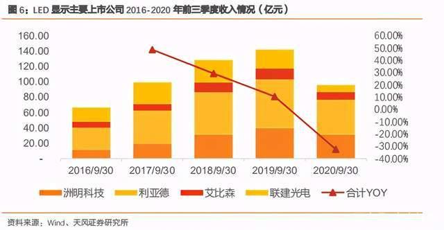 单季度看,受疫情影响,2020 年前三季度,主要的 LED 显示屏公司收入都大幅低于去年同比数据,随着疫情回暖,新基建的投入,LED 显示总体收入环比有所增长。