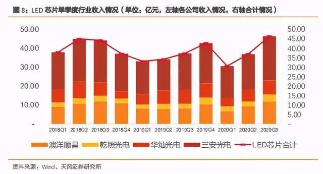 从中国台湾地区 LED 芯片环节来看,我们也能看到月度的环比增长。分季度看,2020Q2中国台湾地区 LED 芯片环节合计收入为 13.35 亿元,同比减少 11.30%;2020Q3,随着 LED行业回暖,收入合计为 15.78 亿元,同比去年增加 0.01 亿元;截至 2020 年 10 月单月,中国台湾 LED 芯片合计收入为 6.02 亿元,同比增加 16.89%。因此,结合中国地区 LED 芯片厂商来看,整体 LED 芯片环节收入景气度逐步回暖。