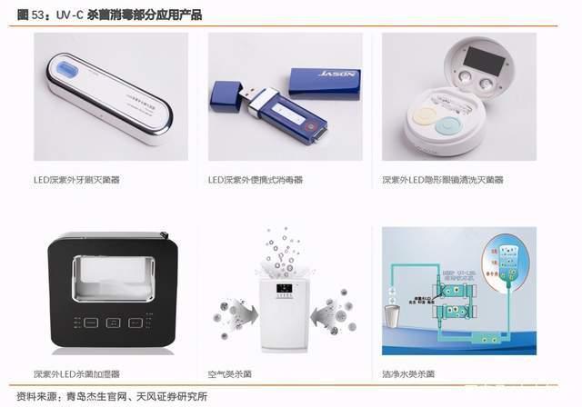 受益疫情,UVC 下游需求暴增。各类 UVC 产品陆续推出市场包含半永久性 UV 功能口罩、口罩消毒盒、车规级杀菌盒、电梯扶手杀菌机、杀菌家电等。此次疫情提高人们对健康消毒的意识,2020 年 UVC 有望进入高速增长的元年。供应链吃紧,部分 UVC LED 厂商订单已经排满到今年八月之后,且受惠于 UVC LED 订单挹注,多数厂商今年的 UVC LED 营收目标上看双位数年成长。