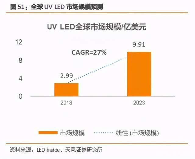 紫外半导体市场快速发展。2018 年全球 UV LED 市场规模达 2.99 亿美元,据 LED inside 估计,预计到 2023 年 UV LED 市场规模将达 9.91 亿美元,2018-2023 年复合增长率达到27%。