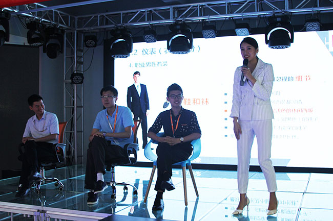 正所谓“一着不慎,满盘皆输”!霍老师强调,在着装方面,除了衣服与鞋子需关注样式、质地与颜色的搭配以外,袜子也是一个要注重的地方,并现场点兵点将,请大家一起找“亮点”。