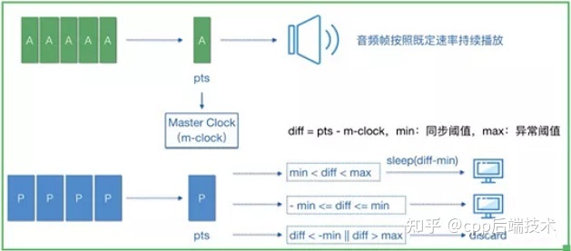 一般音视频同步的做法有三种:视频同步到音频、音频同步到视频、音视频同步的外部时钟。