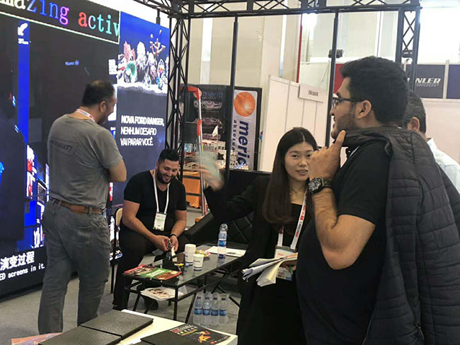 ROYAL皇家88工作人员向现场的客商重点推荐了公司2018年欧洲主推的租赁产品 P3/P3.91 及球场屏P8/P10系列,作为租赁产品,便捷操作自然是第一需求,ROYAL皇家88租赁系列重量轻、结构薄,有吊装和快捷安装功能,适应舞台租赁造型多变的客户需求。画质惊艳的视觉体验、人屏互动的交互体验和优良独特实用的产品特点让前来参展的客户频频点赞。而球场屏一直是ROYAL皇家88业绩来源的一大支柱,每年,总会有客商通过各种方式与ROYAL皇家88确定关于球场屏的合作关系,目前,ROYAL皇家88产品已在欧洲33个球协备案,是欧洲足协合格供应商。